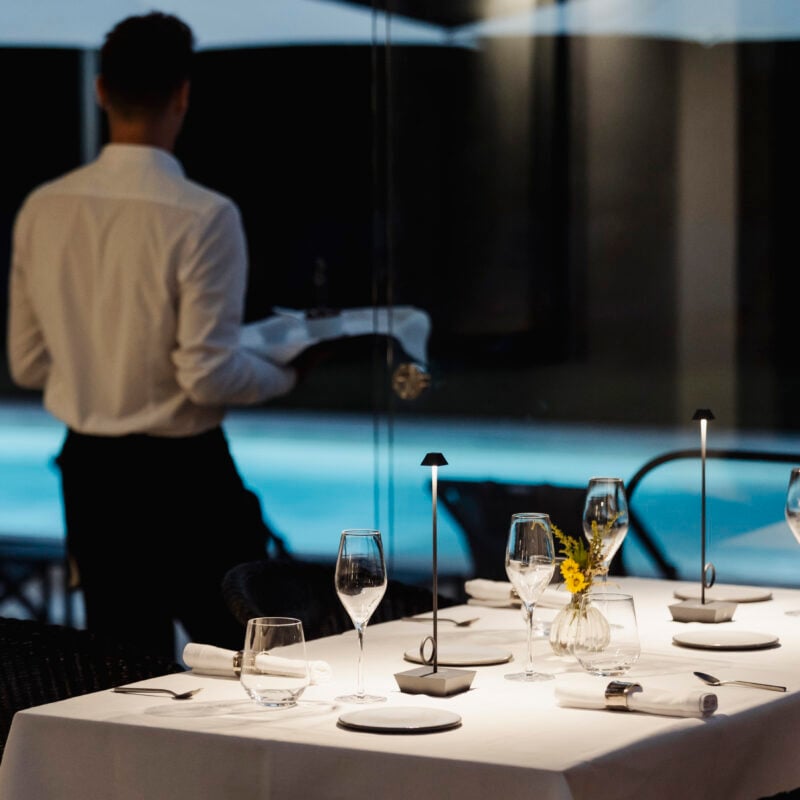 Ambienti eleganti in un giardino lussureggiante ospitano la piscina riscaldata e il ristorante esterno.